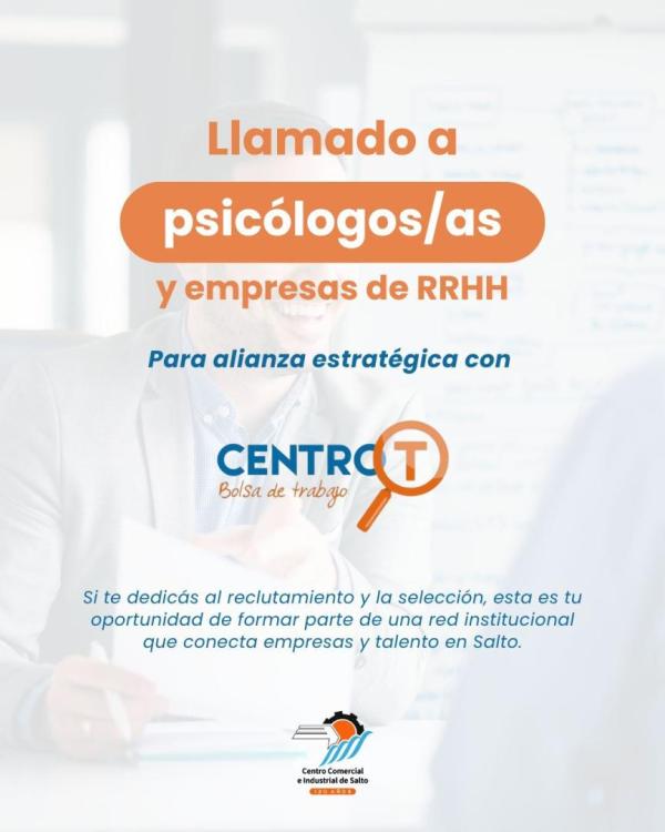 El Centro Comercial e Industrial de Salto, a través de su Bolsa de Trabajo CentroT, abre un llamado a profesionales y empresas especializadas en reclutamiento y selección de personal para integrar una red de aliados estratégicos.